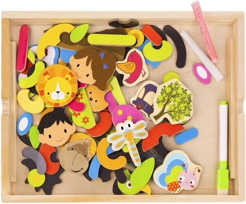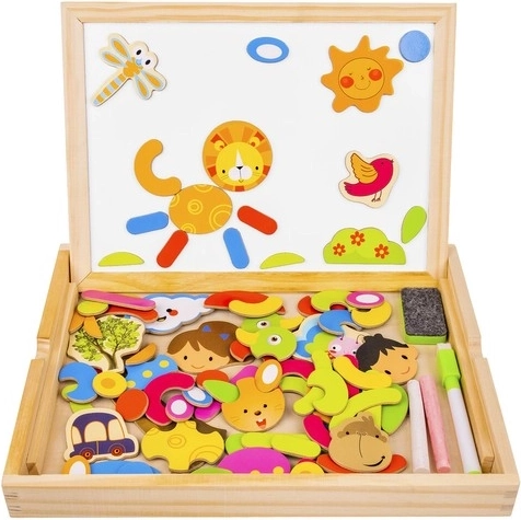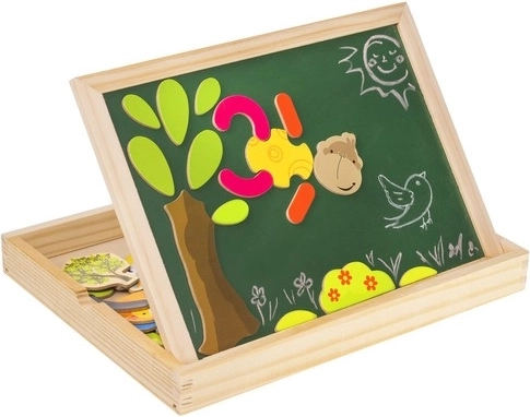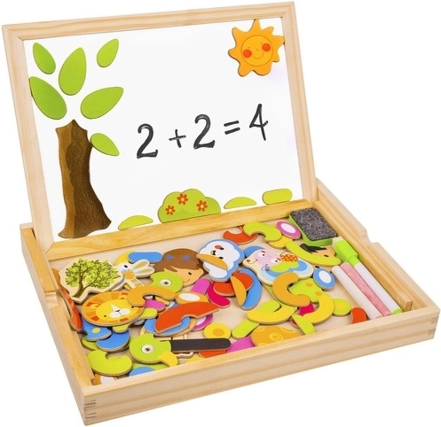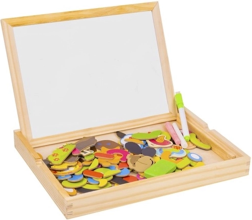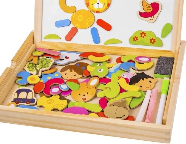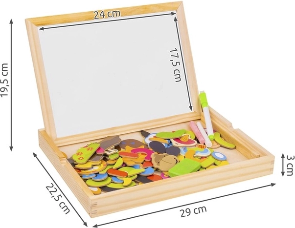 Bringen Sie Ihren Kindern Stunden voller Spaß und kreativem Lernen mit dieser hölzernen magnetischen Tafel! Die Tafel bietet zwei Seiten: schwarz für das Zeichnen mit Kreide und weiß für das Schreiben mit Filzstift oder Arrangieren von Magnetbildern. Dank der Broschüre mit Beispielen können Kinder verschiedene Muster und Motive erstellen.
