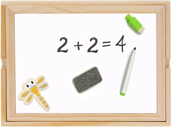 Die Tafel bietet zwei variable Flächen - eine weiße für das Schreiben mit Filzstift und eine schwarze für das Zeichnen mit Kreide, was verschiedene kreative Spielweisen ermöglicht.