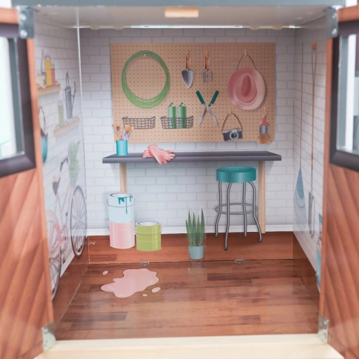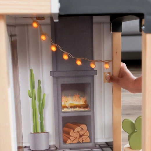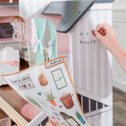 Das Haus kommt mit 24 Teilen an Möbeln und Zubehör, darunter elektronische Elemente – ein Kühlschrank und eine Terrasse mit Lichteffekten sowie eine Toilette mit Geräusch. Ein Stickerbogen für individuelle Gestaltung ist ebenfalls enthalten. Dank der robusten Konstruktion eignet es sich auch perfekt für das gemeinsame Spielen mehrerer Kinder und passt ideal zu Puppen gängiger Größe bis 30 cm.
