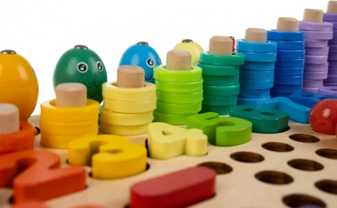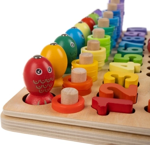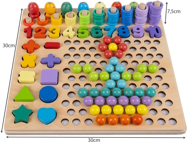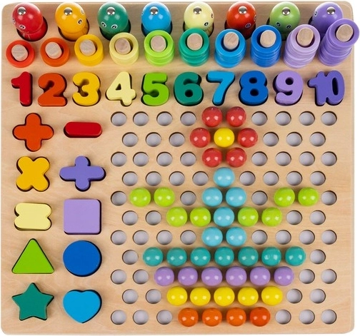 Das Set enthält zweiseitige Vorlagen, Ziffern, mathematische Symbole sowie farbige Ringe und Kügelchen zum Legen von Mustern. Dank der Holzgrundlage ist das Spielzeug robust und stabil, die leuchtenden Farben motivieren zur Kreativität und das Kind erwirbt spielend die Grundlagen der Mathematik.