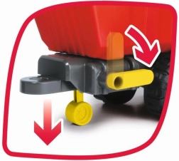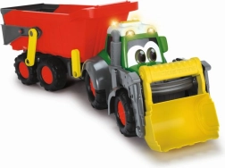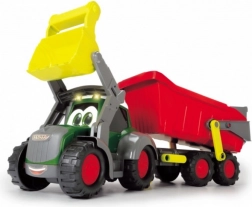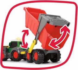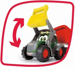Der Traktor hat eine bewegliche Schaufel und einen Anhänger mit Kippfunktion, was das einfache Laden und Entladen von Material ermöglicht.