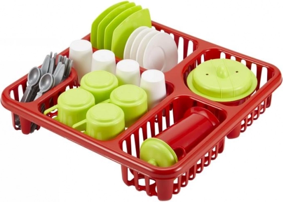 Dieses große Geschirrset mit Abtropfgestell ist ideal für die ersten Küchenabenteuer. Es umfasst eine bunte Auswahl an Zubehör – von Bechern und Tellern bis hin zu Topf und Kännchen mit Deckel. Das stabile Abtropfgestell mit den Maßen 29,5 × 10 × 29,2 cm hält alles ordentlich an seinem Platz und fördert Ordnungssinn.