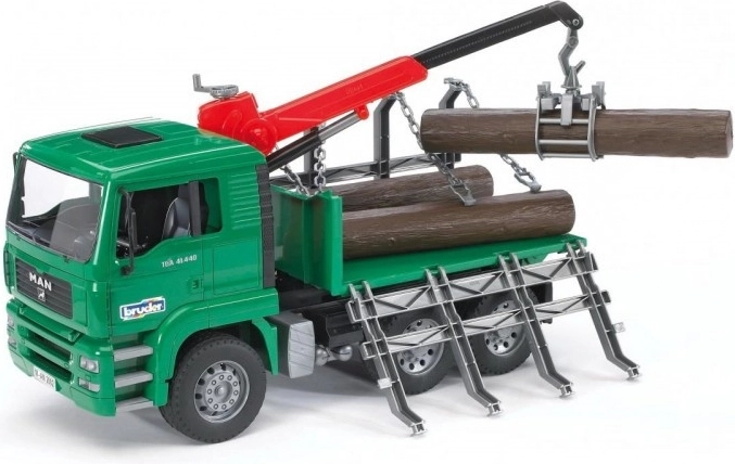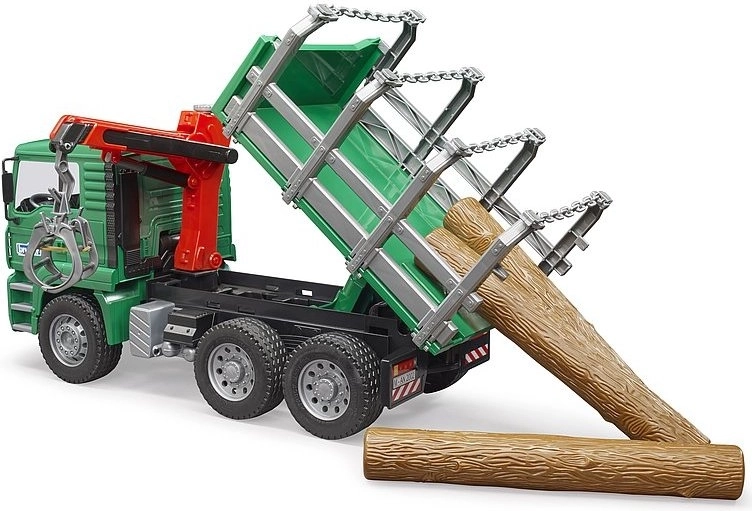 Der Bruder MAN LKW mit Holztransportanhänger ist ein detailreich ausgearbeitetes Kunststoffmodell im Maßstab 1:16. Der LKW ist mit einem drehbaren Kran hinter der Kabine ausgestattet, der ein einfaches Be- und Entladen des Holzes ermöglicht. Im Lieferumfang sind drei realistische Baumstämme enthalten, die das Spiel noch authentischer machen.