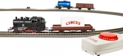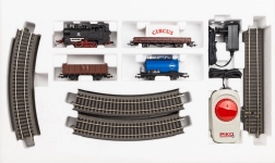 • Lieferumfang: Dampflokomotive (1 Stk), Güterwagen – Hochbord-, Flach-, Kesselwagen (3 Stk), R2-Bogenstücke mit Bettung (12 Stk), G231-Geradengleis mit Bettung (1 Stk), G231-Geradengleis mit Einspeisung (1 Stk), Unterlage für Einspeiseklemme (1 Stk), Einspeiseklemme (1 Stk), einfacher Analogregler mit Netzteil (1 Stk).