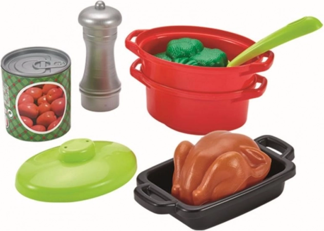 Mit diesem kompletten Kochgeschirrset können Kinder endlose Stunden kochen genießen. Das Set beinhaltet Töpfe mit Deckeln, Tiegel, Pfanne, Backform und verschiedene Lebensmittel, die Realismus verleihen.