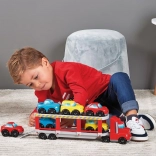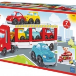 Attraktiver Abrick Transporter zum Transport von Autos! Der Transporter ist mit einer klappbaren Rampe ausgestattet, die einfaches Be- und Entladen von sechs bunten Autos ermöglicht.