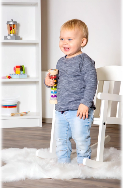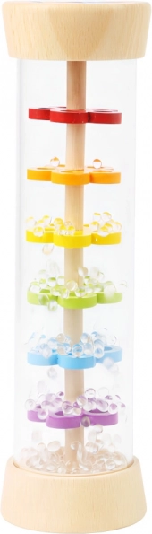 Dieser Regenstab kombiniert natürliches Holz und widerstandsfähigen Kunststoff zu einem sicheren und attraktiven Spielzeug für die Kleinsten. Beim Neigen oder Schütteln entsteht ein authentischer Klang sanften Regens, der die Sinne beruhigt – bei Kindern wie Erwachsenen. Der transparente Zylinder zeigt farbenfrohe Kugeln und blumenförmige Elemente, die das Spiel visuell spannend machen.