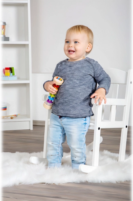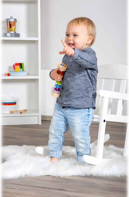 Ideal zur Förderung der akustischen und visuellen Wahrnehmung, zur Unterstützung der Feinmotorik und für erste Erfahrungen mit Rhythmus. Geeignet ab 6 Monaten als sichere Rassel, die das Kind fesselt und zugleich bei Konzentration und Beruhigung hilft.