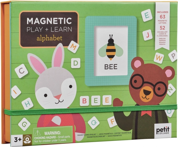 Entdecken Sie spielerisches Alphabet-Lernen mit dem mehrsprachigen Set von Petit Collage. Kinder lernen Buchstaben und Grundwortschatz auf Englisch, Deutsch, Spanisch und Französisch – anhand übersichtlicher Karten und magnetischer Buchstaben, die sich leicht anordnen und immer wieder verwenden lassen.