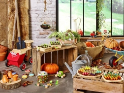 Das Set aus 14 illustrierten Perlen (z. B. Aubergine, Tomate, Vögelchen, Gummistiefel) fördert die Fantasie, das Erlernen von Farben und das Benennen.