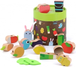 Entdecken Sie das verspielte Auffädelspiel mit Gartenmotiv der Marke VILAC, das Kinder ab 18 Monaten begeistert. Das Set enthält 14 Holzteile (Tiere, Obst, Gemüse, Gummistiefel u. a.) und eine Textilschnur mit Sicherheitsverschlüssen. Es fördert die Feinmotorik, die Hand-Auge-Koordination sowie die Geduld und lädt zu kreativem, farbenfrohem Spiel ein.