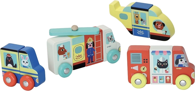 Vier verschiedene Fahrzeuge mit magnetischen Teilen ermöglichen es Kindern, sowohl passende als auch lustige Mixe zu bauen, die Kreativität und logisches Denken fördern.