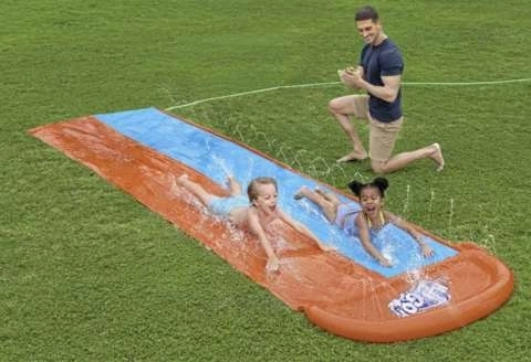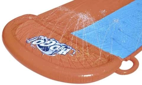 Diese lange Garten-Wasserrutsche bietet zwei parallele Fahrspuren für spannende Wettkämpfe von Kindern und Erwachsenen. Seitliche Kaskaden von Wasserdüsen halten die Oberfläche stets nass, sodass die Fahrt auch an heißesten Tagen schnell, sanft und erfrischend ist.