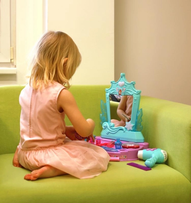 Dieses stylische Schminktisch-Set in türkis‑violetter Farbkombination bringt Kindern stundenlangen kreativen Spielspaß. Das Highlight ist der Spiegel mit Licht- und Soundeffekten – nach der Aktivierung erklingen Melodien, die die Atmosphäre beim Friseur- oder Kosmetiksalon-Spiel verstärken.