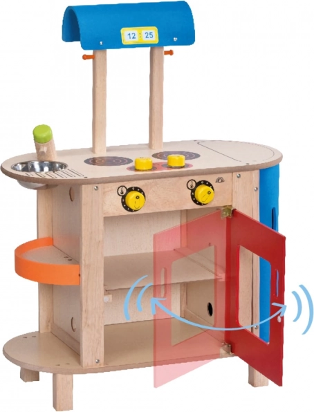 Die Küche enthält einen multifunktionalen Herd mit integriertem Ofen und einem Zweiplattenkochfeld. Die Regler geben Klickgeräusche ab für ein realistisches Spiel.