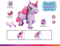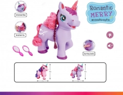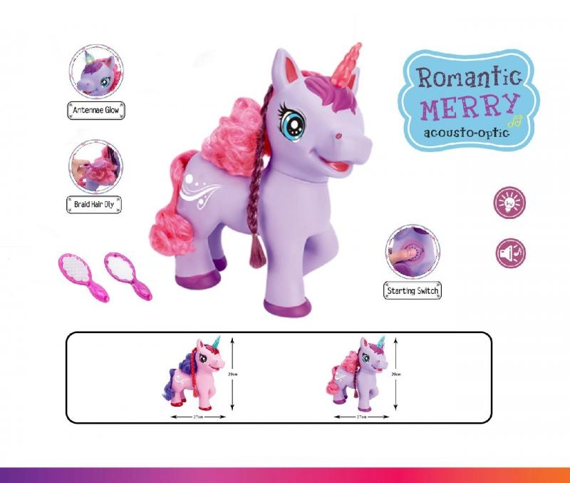 Dieses niedliche lila Einhorn mit Batteriebetrieb begeistert Kinder mit seinen Effekten – beim Drücken des Knopfs am Bauch beginnt es ein englisches Lied zu singen, macht magische Geräusche und sein Horn leuchtet. Im Set enthalten sind ein Kamm und ein Spiegel zum Kämmen der langen Mähne.