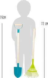 Der Spaten misst 76 cm, die Harke 72 cm. Die Größe ist auf Kinderhände abgestimmt – für sicheres und freudiges Arbeiten im Garten.
