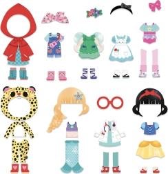 Kleider, Schuhe, Hüte und Accessoires – die magnetischen Teile lassen sich im Handumdrehen anbringen und wechseln. Kinder trainieren ihre Feinmotorik und Kreativität.