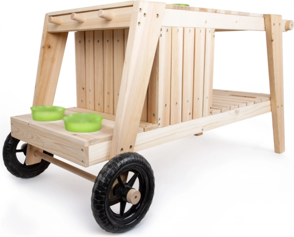 Einfaches Bewegen wird durch große Räder gewährleistet, die auch die Bewegung auf unebenem Gelände ermöglichen. Die Funktionalität wird durch Metallelemente ergänzt, wie Schalen und Blumentöpfe, die die Spielmöglichkeiten weiter ausdehnen – vom Backen bis zum Gärtnern.