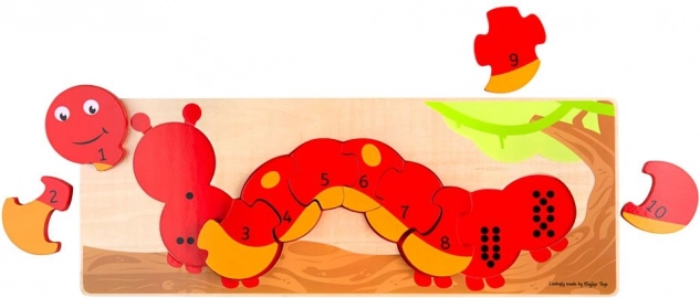 Das Zählpuzzle Raupe BIGJIGS TOYS verbindet Lernen mit Spiel. Kinder legen die nummerierten Teile 1–10 auf die Holzunterlage mit schwarzen Punkten, die der Zahl auf dem jeweiligen Teil entsprechen. So festigen sie ihr Verständnis für Mengen, Farben und Formen und trainieren zugleich die Hand-Auge-Koordination.
