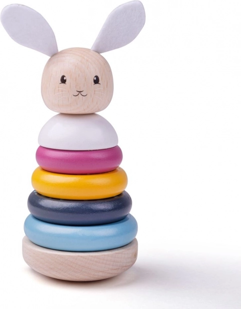 Dieser hochwertige Holz-Steckturm in Pastellfarben ist ein ideales erstes Lernspielzeug. Kinder stapeln die Ringe vom größten zum kleinsten, stärken die Hand-Auge-Koordination und lernen Farben und Formen zu unterscheiden. Textile Ohren und ein Schwänzchen des Häschens verleihen dem Spiel einen taktile[n] Reiz.