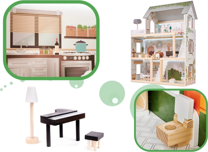 Entdecken Sie die zauberhafte Boho-Welt mit dem Holzpuppenhaus LULILO FLORO mit einer Höhe von 78 cm. Die dreistöckige Konstruktion mit Terrasse, detaillierten Accessoires und LED-Beleuchtung schafft eine gemütliche Atmosphäre für stundenlanges kreatives und fantasievolles Spielen. Sorgfältig geschliffenes Holz, Pastellfarben und eine umfangreiche Ausstattung machen es zu einer wunderschönen Dekoration fürs Kinderzimmer und einem perfekten Geschenk.