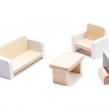 Im Set enthalten sind 16 Möbelstücke: Tisch, Stühle, Bett, Lampe, Sessel, Sofa, Couchtisch, Fernseher, Klavier, Bank, Liegestuhl, Sonnenschirm, Dusche, Waschbecken und Toilette.
