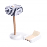 Die Dachterrasse mit Liegestuhl und gestreiftem Sonnenschirm ist ideal zum Relaxen der Puppen und rundet realistische Alltagsszenen ab.