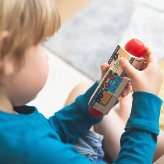Drei drehbare Holzblöcke ermöglichen es, korrekte Bilder zu legen oder neue, lustige Kombinationen zu erschaffen. Ideal zur Förderung von Vorstellungskraft und Konzentration.