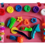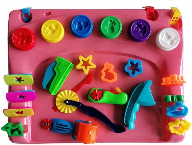 Enthalten ist eine praktische Modellierunterlage, die die Arbeitsfläche schützt und eine stabile Grundlage zum Gestalten bietet. Sechs Becher Knetmasse in beliebten Farben (Rot, Lila, Blau, Gelb, Weiß, Grün) sorgen für endlose Kombinationen und Inspiration.