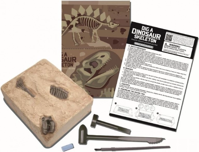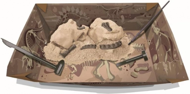 Ein Gipsblock verbirgt Knochenteile, die Kinder mit den beiliegenden Werkzeugen nach und nach freilegen – wie auf einer echten archäologischen Expedition.