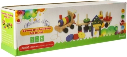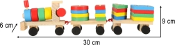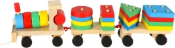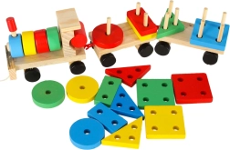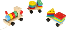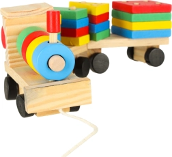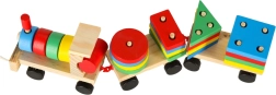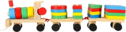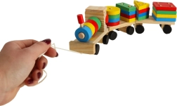 Niedliche Holzeisenbahn mit Lokomotive und zwei Waggons – ein tolles Spielzeug für Kinder ab 3 Jahren. Enthält bunte Bausteine und einen Formensortierer zur Förderung der Motorik, zum Erlernen von Formen und Farben sowie zur Entwicklung logischen Denkens. Der Zug hat bewegliche Räder und eine Zugschnur zum Hinterherziehen, sodass Kinder viel Bewegung und kreatives Spiel genießen.