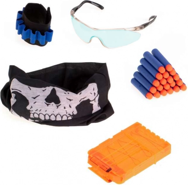 taktische Weste, 20 Schaumstoffpfeile, Kunststoffmagazin für 6 Pfeile, Handgelenk-Armband für Pfeile, Schutzbrille (blau), Bandana/Tuch mit Aufdruck, Verpackung: Folienbeutel