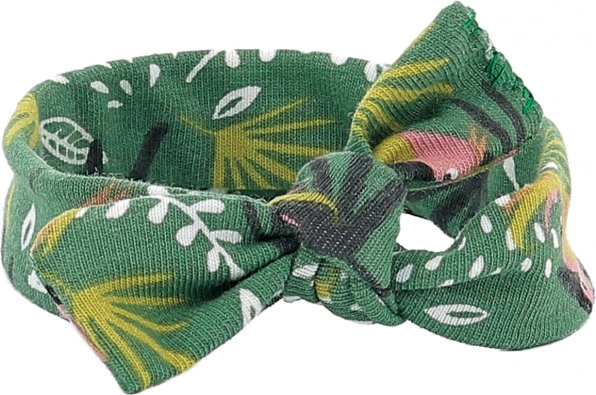 Das Textil-Haarband mit tropischem Druck und Knoten hält die Form und passt wunderbar zu den übrigen Stücken.