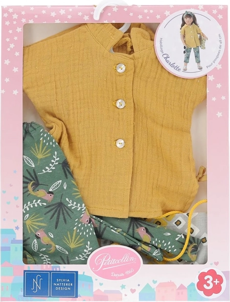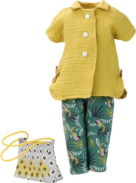 Gönnen Sie Ihrer Puppe ein ausdrucksstarkes Outfit, das mit Farben und detailreicher Verarbeitung überzeugt. Das Set Charlotte kombiniert ockerfarbene Töne mit tropischen Motiven für einen verspielten, modernen Look. Alles ist aus angenehmen Textilien gefertigt, die sich leicht anziehen lassen und gut in Form bleiben.