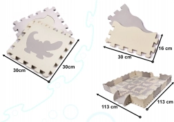 Weiche Kinder-Spielmatte aus Schaumstoff-Puzzleteilen mit herausnehmbaren Formen schafft einen sicheren und kreativen Spielbereich. Dank der erhöhten Ränder lässt sich ein Laufstall bauen, der Spielzeug innen hält. Die Matte ist wasserfest, hat eine rutschfeste Oberfläche und dämpft Stöße hervorragend – ideal für die ersten Schritte. Die neutralen Farben Grau und Ecru passen in jedes Interieur.