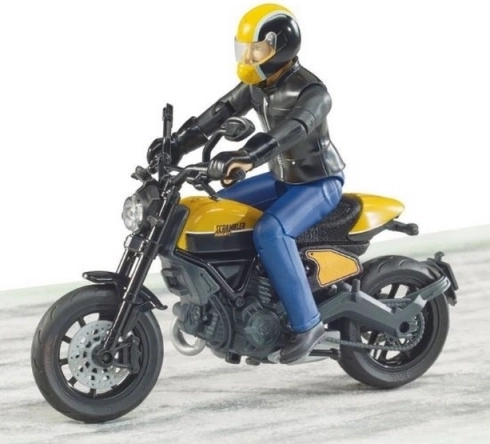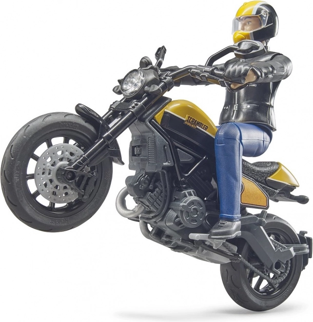 Dieses detailreich gestaltete Modell des Scrambler DUCATI Cafe Racer von BRUDER ist ideal für kleine Motorradfans und Sammler. Die realistische Ausführung – von sichtbaren Motorelementen bis zur Sitzbankform – wird durch eine voll bewegliche Fahrerfigur ergänzt, die natürliche Fahr- und Action-Positionen ermöglicht.