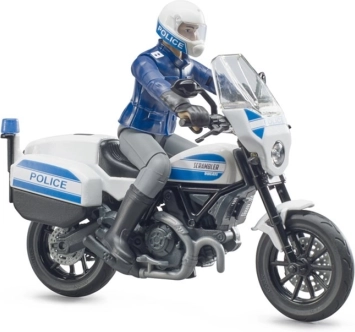 Das Polizeimotorrad DUCATI Scrambler von Bruder ist ein detailgetreues Modell für kleine und große Fans der Rettungsdienste. Das Motorrad hat drehbare Lenkung für einfaches Manövrieren und einen klappbaren Ständer für sicheren Stand. Die Polizistenfigur besitzt bewegliche Gliedmaßen, sodass sie in Fahrposition gesetzt oder neben dem Fahrzeug aufgestellt werden kann.