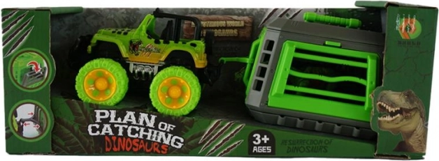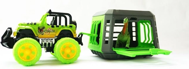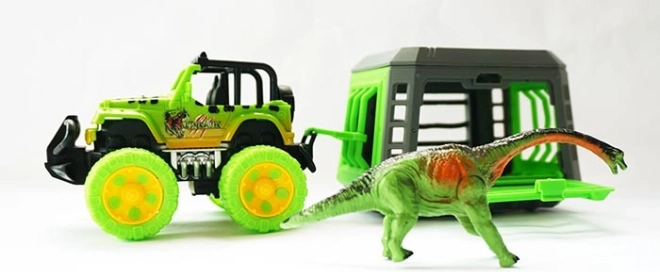 Jeep mit Anhänger und Dinosaurier aus Kunststoff. Der Dinosaurier ist herausnehmbar und der Anhänger abnehmbar.