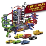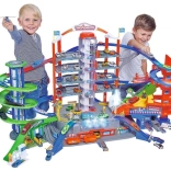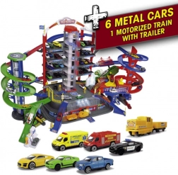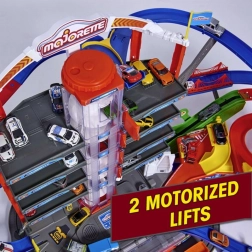 Die große Spielgarage mit einer Breite von fast 1,30 m ist das größte neue Produkt in der Welt von Majorette! Die Garage besteht aus sieben Spielebenen und verfügt über bis zu 35 Park- und Abstellplätze. Das Herzstück der Station ist ein motorisierter Spiralaufzug, der gleichzeitig bis zu neun Metallautos befördert. Oben angekommen, teilen automatische Weichen die Fahrzeuge auf vier verschiedene Fahrspuren auf. Sechs unterschiedliche Licht- und Soundeffekte sowie unzählige Spielstationen wie ein Bahnhof, eine Tankstelle mit Zapfsäule, eine Autowerkstatt und Waschanlage, eine Feuerwache, eine Polizeistation mit geheimem Versteck und ein Hubschrauberlandeplatz bieten grenzenlosen Spielspaß. Enthalten sind 6 Metallautos, ein batteriebetriebener Zug, automatische Weichen, ein Tunnel mit Crash-Funktion und 2 motorisierte Aufzüge. Hubschrauber nicht enthalten. Maße aufgebaut: 128 x 78 x 73 cm.