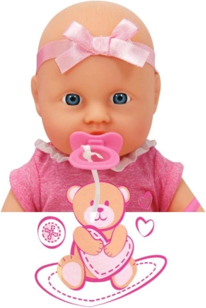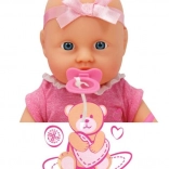 Die Puppe trägt ein rosa Kleid mit Bärenmotiv und Schleife. Sie ist ein beliebter Begleiter für jeden Tag.