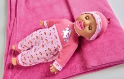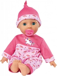 Die Puppe ist in einem rosa Outfit mit Einhornmotiv gekleidet, was sie zu einem reizvollen Spielobjekt für Kinder macht.