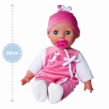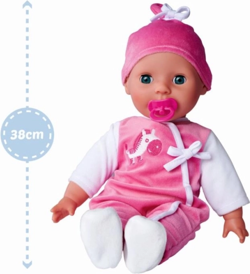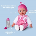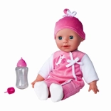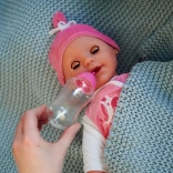 Zur Puppe gehören Zubehörteile wie eine Flasche und ein Schnuller, die das Rollenspiel und die Pflege des Babys erleichtern.