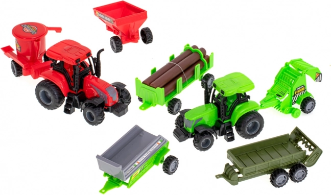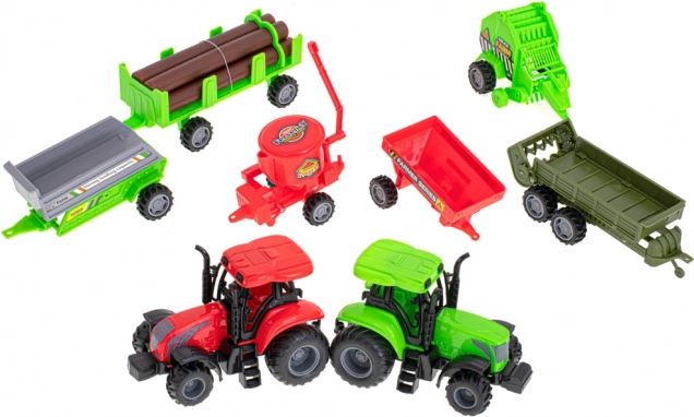 Enthalten sind 2 Traktoren und verschiedene Aufbauten – Ballenanhänger, Sämaschine oder Ballenpresse. Ideal, um echte Arbeiten auf dem Bauernhof nachzuspielen.