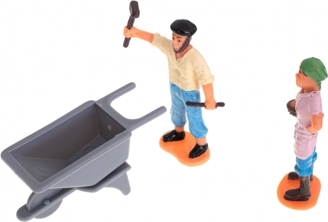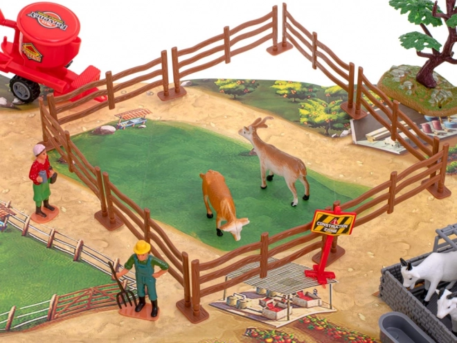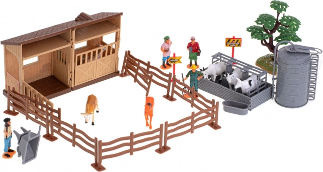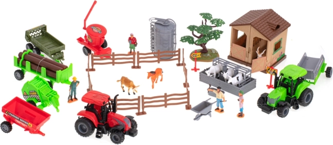 - Aufklappbarer Stall, 2 Traktoren, 3 Anhänger/Aufbauten (z. B. Sämaschine, Ballenpresse, Ballenanhänger), Silo, Baum, 8 Holzzaunelemente, 8 Verbinder (Basen) für den Zaun, 6 Mauersteine, Trog/Tränke, Bauernfiguren, Tiere, Warnschilder und weiteres Zubehör
