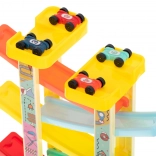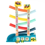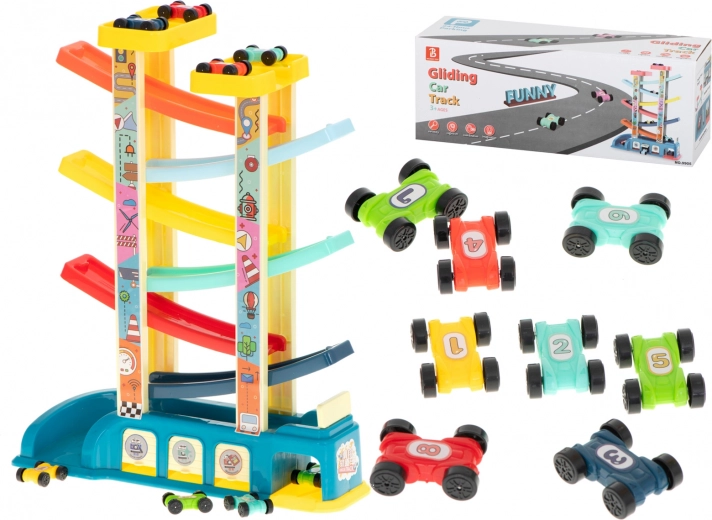 Auf die Plätze, fertig, los! Welches der farbenfrohen Autos erreicht als erstes das Ziel? Die mehrstöckige Rennbahn garantiert actionreiche Abfahrten mit spektakulären Sprüngen zwischen den Etagen und eine flüssige Fahrt bis nach unten. Der Start kann auf zwei Ebenen erfolgen – aus der obersten oder der zweiten Etage – und sorgt so jedes Mal für ein anderes Rennerlebnis.