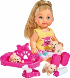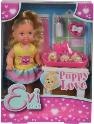 Entdecken Sie die entzückende Evi Puppe mit ihren niedlichen Welpen. Diese charmante Puppe trägt ein hübsches Kleidchen und kommt mit einem Korb voller Welpen, die für stundenlangen Spielspaß sorgen.