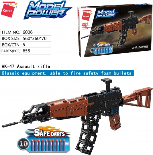 Der Bausatz Qman Model Power 6006 ist inspiriert vom berühmten Kalaschnikow-Sturmgewehr. Nach dem Zusammenbau ermöglicht er es Kindern, sicher stumpfe Schaumstoffpfeile zu schießen. Erhältlich in Form von bunten Kunststoffblöcken, die mit Lego, Sluban, Cobi und anderen Marken kompatibel sind.