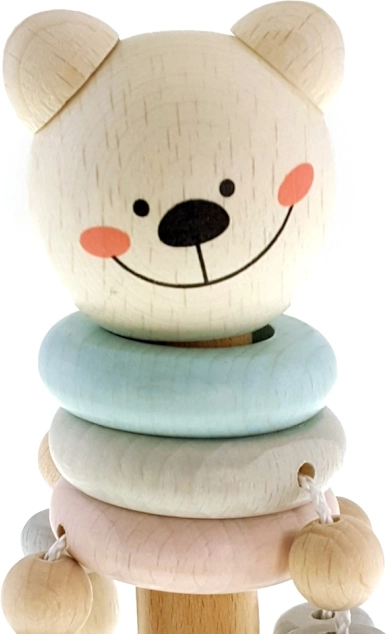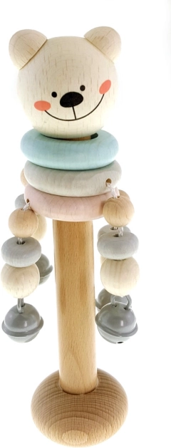 Die Holzrassel HESS in Bärenform ist für die ersten Entdeckungen von Klängen und Formen konzipiert. Angenehme Pastellfarben, eine glatte Oberfläche und Glöckchen motivieren Kinder zum Greifen, Schütteln und Erforschen und fördern so auf natürliche Weise die Feinmotorik und die Sinneswahrnehmung.