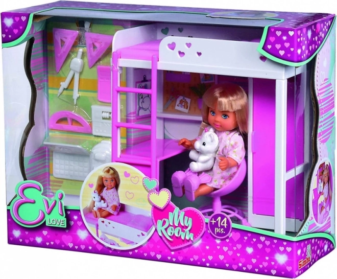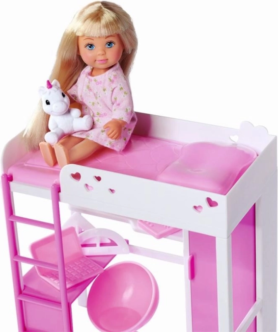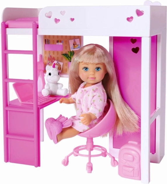 Entdecken Sie ein zauberhaftes Zimmer, in dem Puppe Evi spielt, lernt und sich erholt. Das moderne Hochbett mit Leiter spart Platz und verbirgt darunter eine gemütliche Arbeitsecke mit Schreibtisch und Stauraum. Alles in Weiß‑Rosa mit zarten Herzchen – ein Highlight für kleine Designerinnen.